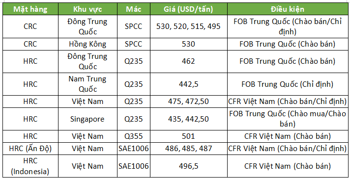 Chỉ số HRC FOB Trung Quốc giảm 1 USD/tấn xuống còn 445 USD/tấn FOB. Một số công ty thương mại đã cắt giảm mức thấp hơn của giá chào bán đối với HRC mác Q235 của Trung Quốc khoảng 3 USD/tấn, xuống tương đương khoảng 440-445 USD/tấn FOB Trung Quốc, do giá chỉ định của người mua đường biển thấp hơn nhiều, ở mức 435 USD/tấn FOB Trung Quốc. Người bán cũng giảm giá chào bán HRC mác Q235 rộng 2 mét của Trung Quốc 3 USD/tấn xuống 475 USD/tấn CFR Việt Nam, do giao dịch chậm. Tuy nhiên, người mua Việt Nam không thể hiện sự quan tâm mua hàng đối với các lô hàng giao tháng 1, do cuộc điều tra chống lẩn tránh thuế đối với hàng nhập khẩu từ Trung Quốc. Một số nhà máy và công ty thương mại Trung Quốc cho biết họ không nhận được bất kỳ giá chào mua nào trong tuần này.