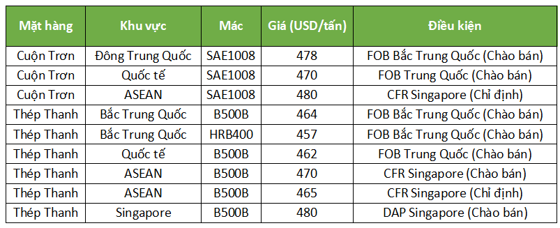 Chỉ số thép thanh FOB Trung Quốc không đổi ở mức 447 USD/tấn FOB trọng lượng lý thuyết. Giá thép thanh nội địa tương đương là 422-443 USD/tấn trọng lượng lý thuyết. Một nhà máy ở miền bắc Trung Quốc giữ giá chào bán thép thanh ở mức 464 USD/tấn FOB cho mác B500B và 457 USD/tấn FOB cho mác HRB400.