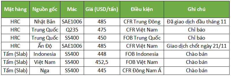 Chỉ số HRC ASEAN giảm 1 USD/tấn xuống 486 USD/tấn do giao dịch chậm. Thị trường nội địa Việt Nam vẫn yếu, với khối lượng bán HRC tháng 11 của hai nhà sản xuất trong nước giảm 40-5% so với tháng 10. Những người tham gia thị trường cho rằng các nhà máy thép nội địa có thể hạ giá chào bán trong đợt tiếp theo để kích thích doanh số.