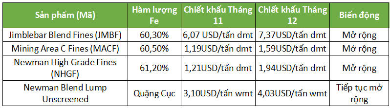 Tập đoàn BHP của Úc đã công bố mức chiết khấu hàng tháng đối với các sản phẩm chính cho hợp đồng tháng 12. Tất cả các mức chiết khấu này đều được neo theo chỉ số 62% tháng 12.