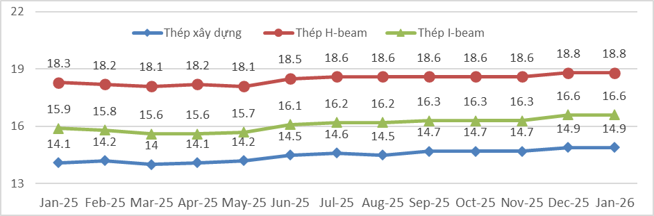 Giá bán sản phẩm thép hình H-beam trung bình từ 18.2~18.8 triệu đồng/tấn trong khi giá bán sản phẩm I-beam thấp hơn được sản xuất bởi các nhà sản xuất trong nước.