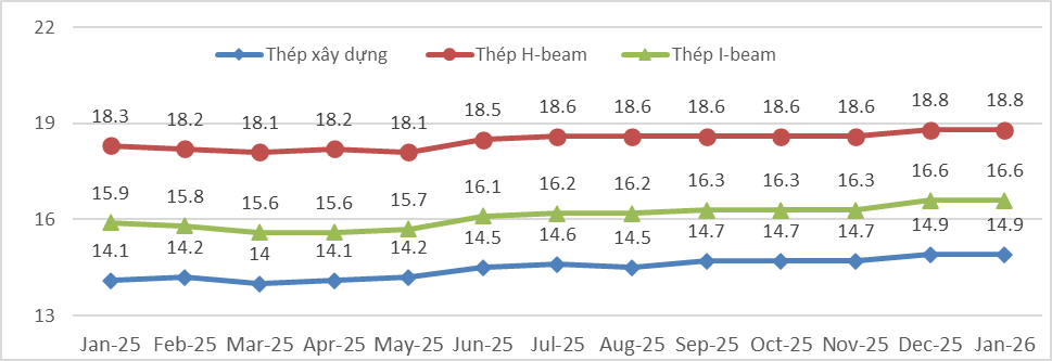 Sau khi điều chỉnh giá bán tại thị trường trong nước trong nửa đầu tháng 1/2026, tình hình thị trường tiêu thụ sản phẩm thép xây dựng vẫn duy trì tín hiệu tích cực, các đại lý đang chuẩn bị cho lượng thép xây dựng tồn kho trước kỳ nghỉ Tết âm lịch. Giá thép cây tại thị trường trong nước duy trì ở mức 13.7 ~ 14.2 triệu đồng/tấn. Giá thép cuộn có giá bán từ 13.6 ~ 13.9 triệu đồng/tấn (giá bán chưa báo gồm VAT). Giá bán chênh lệch giữa các thương hiệu thép xây dựng duy trì ở mức 300~500 ngàn đồng/tấn, các sản phẩm thép xây dựng chủ đạo trên thị trường vẫn là thép xây dựng Hoà Phát, thép Miền Nam, thép Tisco...