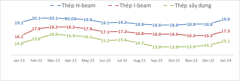 Giá bán sản phẩm thép hình H-beam trung bình từ 18.8~19.2 triệu đồng/tấn trong khi giá bán sản phẩm I-beam thấp hơn được sản xuất bởi các nhà sản xuất trong nước. Giá bán sản phẩm thép hình giảm đáng kể so với thời điểm cùng kỳ năm trước nguyên nhân là chi phí tăng cao do giá nguyên liệu giảm trong thời gian vừa qua, dự báo tình hình giá bán sẽ vẫn có thể giảm theo giá nguyên liệu nhập.