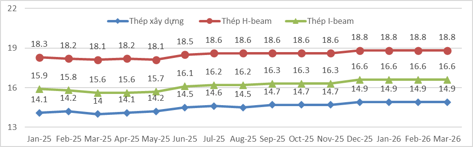 Giá bán sản phẩm thép hình H-beam trung bình từ 18.3~18.9 triệu đồng/tấn trong khi giá bán sản phẩm I-beam thấp hơn được sản xuất bởi các nhà sản xuất trong nước. Giá bán sản phẩm thép hình giảm đáng kể so với thời điểm cùng kỳ năm trước nguyên nhân là chi phí tăng cao do giá nguyên liệu giảm trong thời gian vừa qua, dự báo tình hình giá bán sẽ vẫn có thể giảm theo giá nguyên liệu nhập.