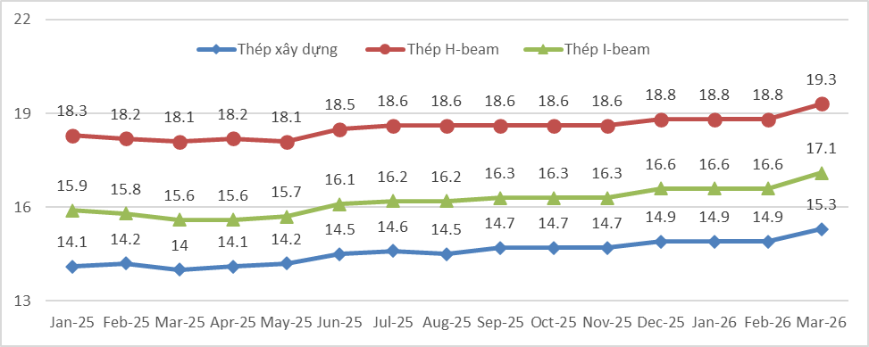 Giá bán sản phẩm thép hình H-beam trung bình từ 18.3~18.9 triệu đồng/tấn trong khi giá bán sản phẩm I-beam thấp hơn được sản xuất bởi các nhà sản xuất trong nước. Giá bán sản phẩm thép hình giảm đáng kể so với thời điểm cùng kỳ năm trước nguyên nhân là chi phí tăng cao do giá nguyên liệu giảm trong thời gian vừa qua, dự báo tình hình giá bán sẽ vẫn có thể giảm theo giá nguyên liệu nhập.