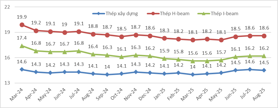Giá bán sản phẩm thép hình H-beam trung bình từ 18.5~18.9 triệu đồng/tấn trong khi giá bán sản phẩm I-beam thấp hơn được sản xuất bởi các nhà sản xuất trong nước. Giá bán sản phẩm thép hình giảm đáng kể so với thời điểm cùng kỳ năm trước nguyên nhân là chi phí tăng cao do giá nguyên liệu giảm trong thời gian vừa qua, dự báo tình hình giá bán sẽ vẫn có thể giảm theo giá nguyên liệu nhập.