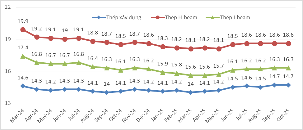 Giá bán sản phẩm thép hình H-beam trung bình từ 18.2~18.6 triệu đồng/tấn trong khi giá bán sản phẩm I-beam thấp hơn được sản xuất bởi các nhà sản xuất trong nước. Giá bán sản phẩm thép hình giảm đáng kể so với thời điểm cùng kỳ năm trước nguyên nhân là chi phí tăng cao do giá nguyên liệu giảm trong thời gian vừa qua, dự báo tình hình giá bán sẽ vẫn có thể giảm theo giá nguyên liệu nhập.