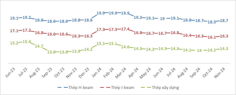 Giá bán sản phẩm thép hình H-beam trung bình từ 18.1~18.5 triệu đồng/tấn trong khi giá bán sản phẩm I-beam thấp hơn được sản xuất bởi các nhà sản xuất trong nước. Giá bán sản phẩm thép hình giảm đáng kể so với thời điểm cùng kỳ năm trước nguyên nhân là chi phí tăng cao do giá nguyên liệu giảm trong thời gian vừa qua, dự báo tình hình giá bán sẽ vẫn có thể giảm theo giá nguyên liệu nhập.