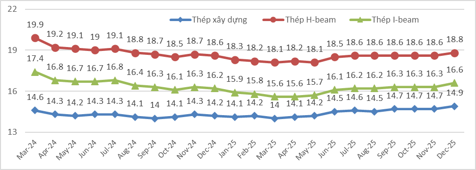 Tín hiệu khởi sắc tại các nhà máy sản xuất thép xây dựng trong tuần này, sản lượng có sự cải thiện nhờ nhu cầu tăng tại thị trường trong nước tại thời điểm cuối năm. Tình hình tiêu thụ sản phẩm thép xây dựng cũng dần hồi phục trở lại nhờ vào nhu cầu từ các ngành xây dựng, các dự án đầu tư dài hạn được khởi công. Bên cạnh đó, thị trường bất động sản tại các thành phố lớn đã trải qua giai đoạn khó khăn nhất và đang trên đà hồi phục, các dự án nhà ở xã hội được triển khai mạnh mẽ, công trình giao thông được mở rộng và cải tạo góp phần tăng lượng tiêu thụ sản phẩm thép xây dựng trong nước. Giá thép nội địa giữ ở mức ổn định trong tháng 12 duy trì ở mức 14.2 – 14.9 triệu đồng/tấn, giá bán tăng giảm trái chiều giữa các đơn vị cung cấp và phụ thuộc vào khối lượng cũng như thoả thuận giữa bên mua và bên bán kèm theo các chính sách hỗ trợ.
