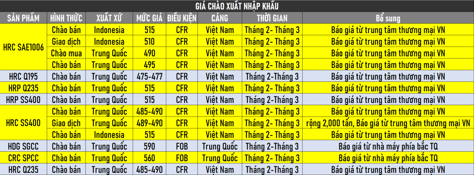 Chào bán HRC Trung Quốc và Indonesia về Việt Nam hầu như ổn định so với đầu tuần dù không có nhiều nhu cầu, do người bán muốn giữ giá trước mức lời ít ỏi và chờ xem xu hướng giá rõ hơn vào tuần tới. Chào bán HRC Q195 và Q235 ổn định mức 485-490 USD/tấn cfr Việt Nam cho thép Trung Quốc.