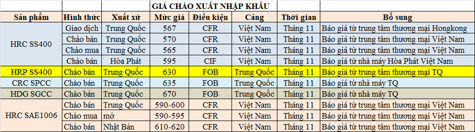 Một thỏa thuận khối lượng nhỏ SS400 HRC của Trung Quốc đã được ký kết với giá 567 USD/tấn cfr tại Việt Nam trong tuần này, tầm 547 USD/tấn fob Trung Quốc. Những người tham gia cho biết, thỏa thuận đó được bán khống bởi các nhà giao dịch kỳ vọng giá sẽ sớm giảm do lượng mua ít và đồng nhân dân tệ giảm nữa. 567 USD/tấn cfr Việt Nam vẫn có sẵn khi các nhà giao dịch chào bán ở mức 570 USD/tấn cfr Việt Nam.