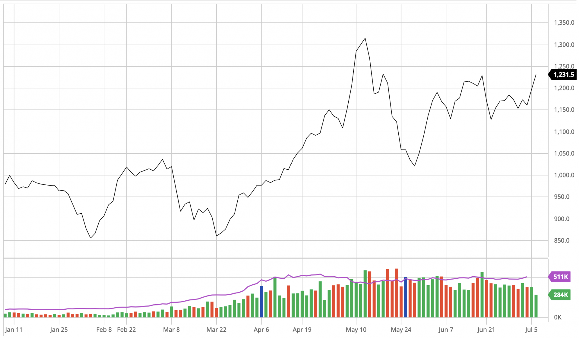 Diễn biến giá quặng sắt giao tháng 9/2021 trên sàn DCE kể từ đầu năm đến nay (Đồ hoạ: Barchart.com)