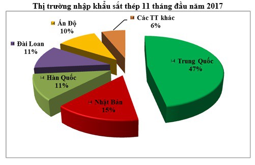 Lượng sắt thép nhập khẩu về Việt Nam trong 11 tháng đầu năm 2017 tuy giảm 17,4% về lượng, nhưng kim ngạch lại tăng 13,6% so với 11 tháng đầu năm 2016, đạt 13,89 triệu tấn, trị giá trên 8,26 tỷ USD.