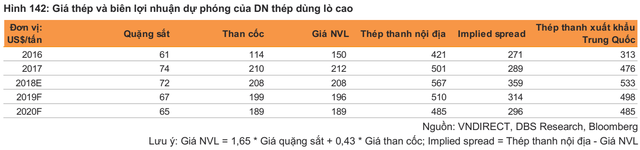 Năm nay, giá quặng sắt và than cốc cũng được kỳ vọng sẽ tiếp tục giảm vì nguồn cung gia tăng và nhu cầu yếu dần tại Trung Quốc. Trong kịch bản cơ sở, VNDIRECT giả định giá thép xây dựng trong nước sẽ giảm 10% trong năm 2019. Biên lợi nhuận của các nhà sản xuất thép trong nước sẽ thu hẹp lại do giá đầu ra sẽ có thể giảm nhanh hơn so với giá nguyên vật liệu đầu vào.