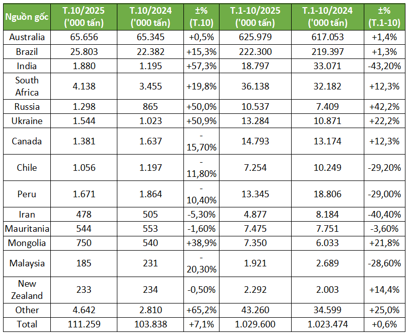 Dữ liệu hải quan cho thấy nhập khẩu quặng sắt của Trung Quốc trong tháng 10 đã tăng 7,1% so với cùng kỳ năm trước, đạt 111,26 triệu tấn. Tổng lượng nhập khẩu trong giai đoạn từ tháng 1 đến tháng 10 tăng nhẹ 0,6%, đạt 1.029,60 triệu tấn so với cùng kỳ năm trước.